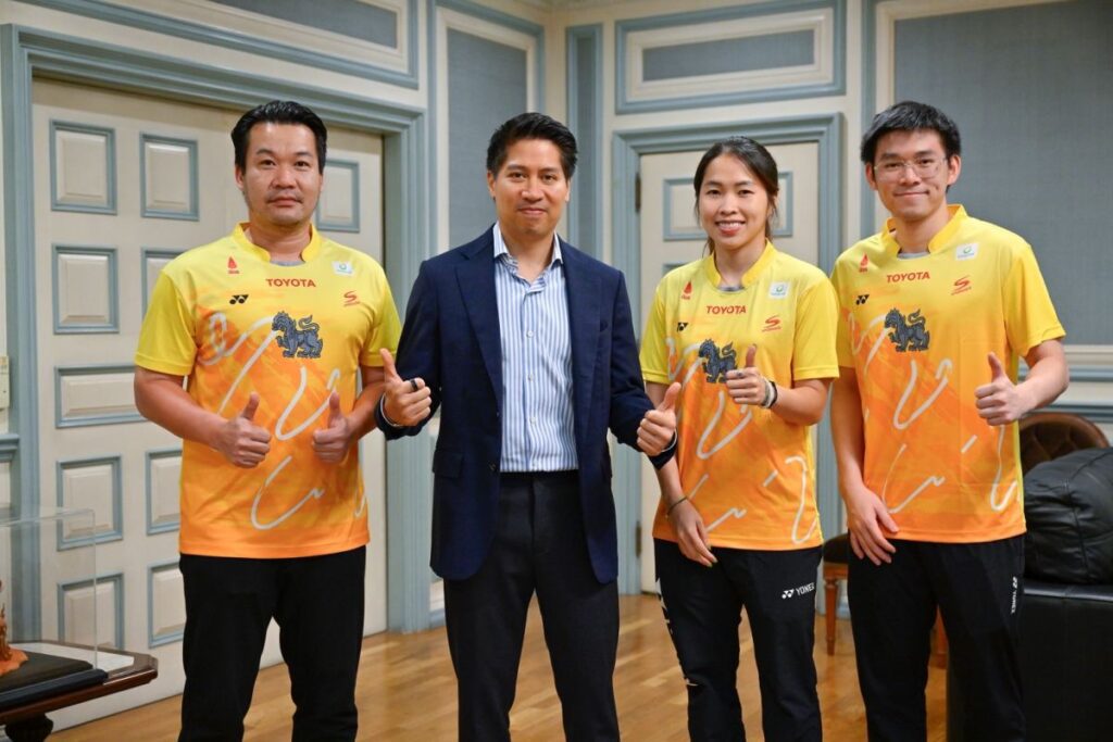 “โค้ชเป้” ภัททพล เงินศรีสุข ผู้อำนวยการโรงเรียนแบดมินตันบ้านทองหยอด นำนักกีฬาในสังกัด “วิว” กุลวุฒิ วิทิตศานต์ นักแบดมินตันชายมือหนึ่งของโลก และ “เมย์” รัชนก อินทนนท์ อดีตนักแบดมินตันหญิงมือหนึ่งของโลก เข้าขอบคุณ นายสันติ ภิรมย์ภักดี ประธานกรรมการบริหาร บริษัท บุญรอดบริวเวอรี่ จำกัด, นายภูริต ภิรมย์ภักดี กรรมการผู้จัดการใหญ่ บริษัท บุญรอดบริวเวอรี่ จำกัด และนายปิติ ภิรมย์ภักดี กรรมการรองกรรมการผู้จัดการใหญ่ บริษัท บุญรอดบริวเวอรี่ จำกัด ที่ บริษัท บุญรอดบริวเวอรี่ จํากัด เมื่อวันที่ 26 มิถุนายน 2568