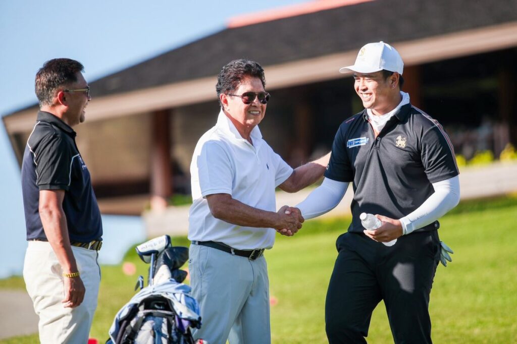 นายสันติ ภิรมย์ภักดี แสดงความยินดีกับ ธนภัทร พิชัยกุล (ภาพ: All Thailand Golf Tour)