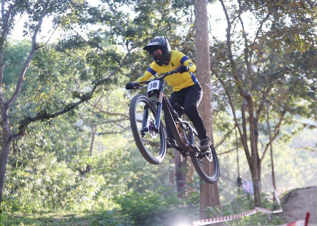 เมธาสิทธิ์ บุญเสน่ห์ (22) นักจักรยานเสือภูเขาดาวน์ฮิลทีมชาติไทย ควบสองล้อคู่ใจ กระโดดข้ามเนิน ก่อนเข้าเส้นชัย คว้าเหรียญทองแรกให้ทัพจักรยานไทย