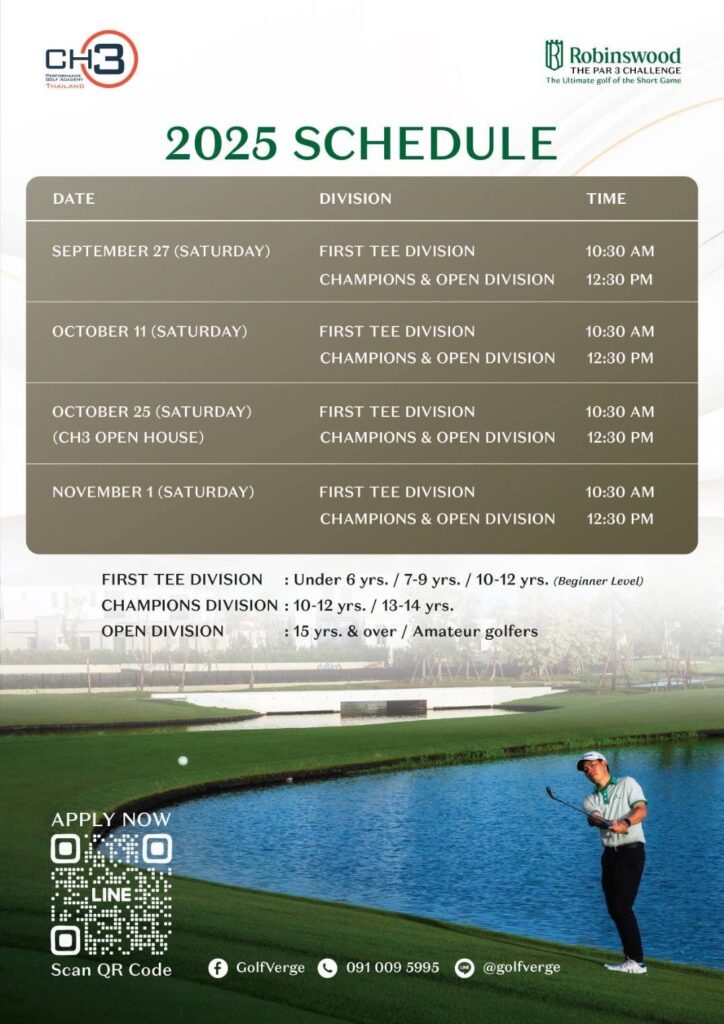 โรบินส์วูด เดอะ พาร์ 3 ชาลเลนจ์ 2025 จัดการแข่งขันรวม 4 สนาม ดังนี้ สนามที่ 1 วันเสาร์ที่ 27 กันยายน 2568, วันเสาร์ที่ 11 ตุลาคม 2568, วันเสาร์ที่ 25 ตุลาคม 2568 และวันเสาร์ที่ 1 พฤศจิกายน 2568 แบ่งการแข่งขันของเป็น 3 กลุ่มการแข่งขัน คือ เฟิร์สที ดิวิชั่น (9 หลุม) สำหรับนักกอล์ฟเยาวชนมือใหม่ อายุต่ำกว่า 6 ปี จนถึง 12 ปี, แชมเปียนส์ ดิวิชั่น (18 หลุม) อายุ 10-14 ปี สำหรับนักกอล์ฟเยาวชนที่ต้องการพัฒนาทักษะในเรื่องของชอร์ตเกม และ โอเพ่น ดิวิชั่น (18 หลุม) อายุตั้งแต่ 15 ปีขึ้นไป-ไม่จำกัดอายุ สำหรับนักกอล์ฟสมัครเล่นทั่วไป