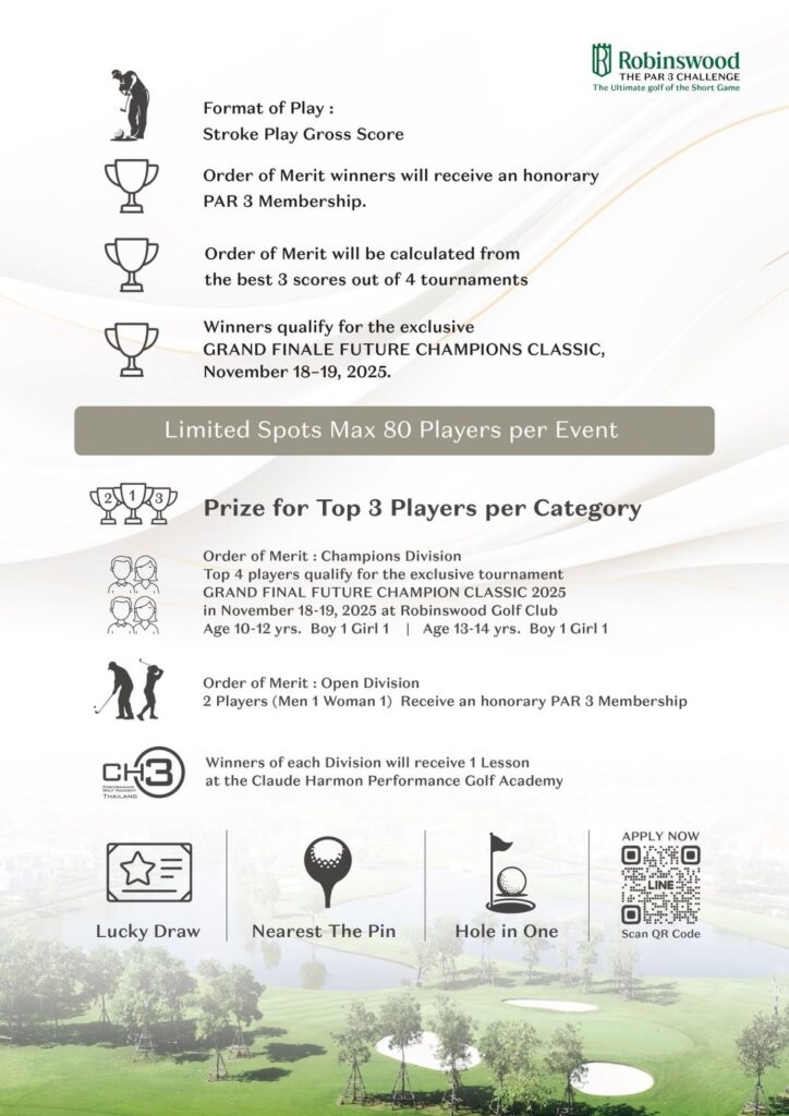 ผู้ชนะออเดอร์ ออฟ เมอริต ในรุ่นแชมเปียนส์ ดิวิชั่น (ชาย 2 หญิง 2) จำนวน 4 คน จะได้รับสิทธิ์เข้าร่วมแข่งขันกอล์ฟเยาวชนรายการฟิวเจอร์ แชมเปียนส์ คลาสสิก รอบชิงชนะเลิศในวันที่ 18-19 พฤศจิกายน 2568 ที่สนามพาร์ 72 ของโรบินวูด กอล์ฟ คลับ ส่วนผู้ชนะออเดอร์ ออฟ เมอริตในรุ่นโอเพ่น ดิวิชั่น (ชาย 1 หญิง 1) จำนวน 2 คน จะได้รับสิทธิพิเศษเป็นสมาชิกกิตติมศักดิ์ของ เดอะ พาร์ 3 สนใจสมัครแข่งขันโทร.091-009-5995 หรือแอดไลน์ @golfverge